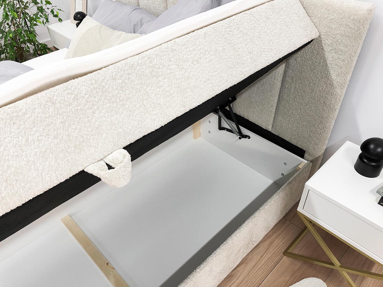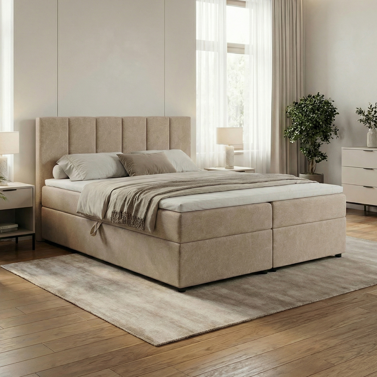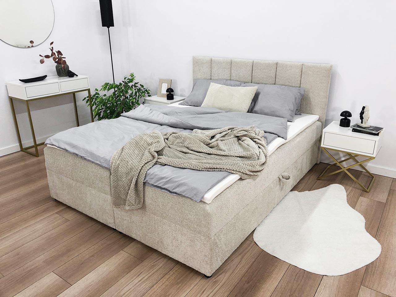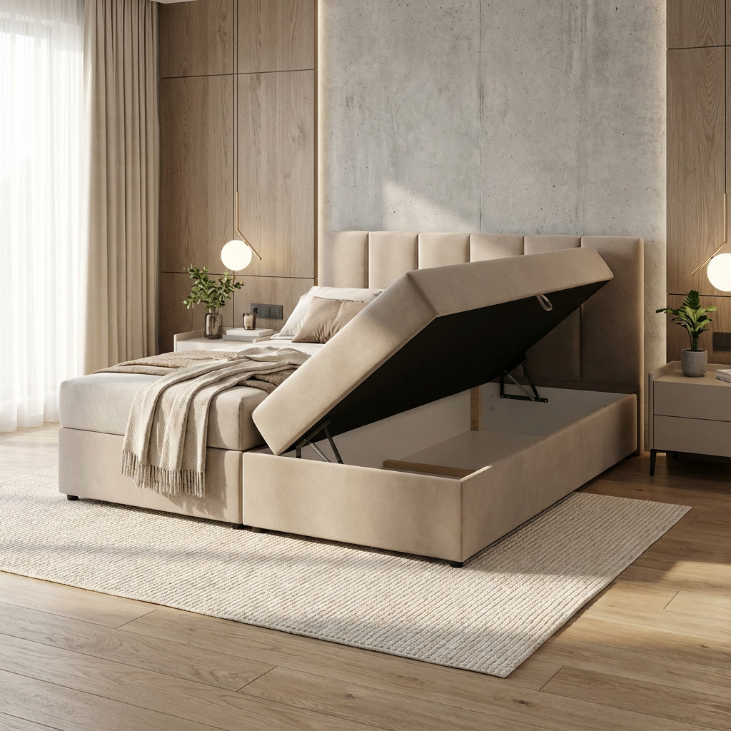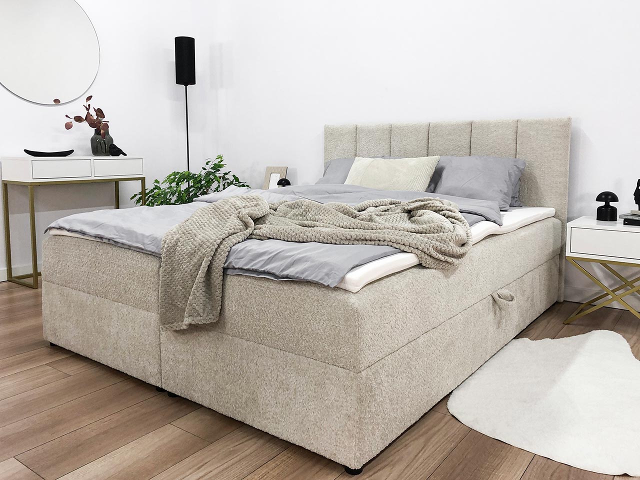 Model wyposażony jest w dwa pojemniki na pościel, otwierane niezależnie, co ułatwia przechowywanie i codzienne użytkowanie. Wysoki zagłówek z pionowymi panelami pełni funkcję dekoracyjną oraz praktyczną, zapewniając wygodne oparcie podczas odpoczynku.