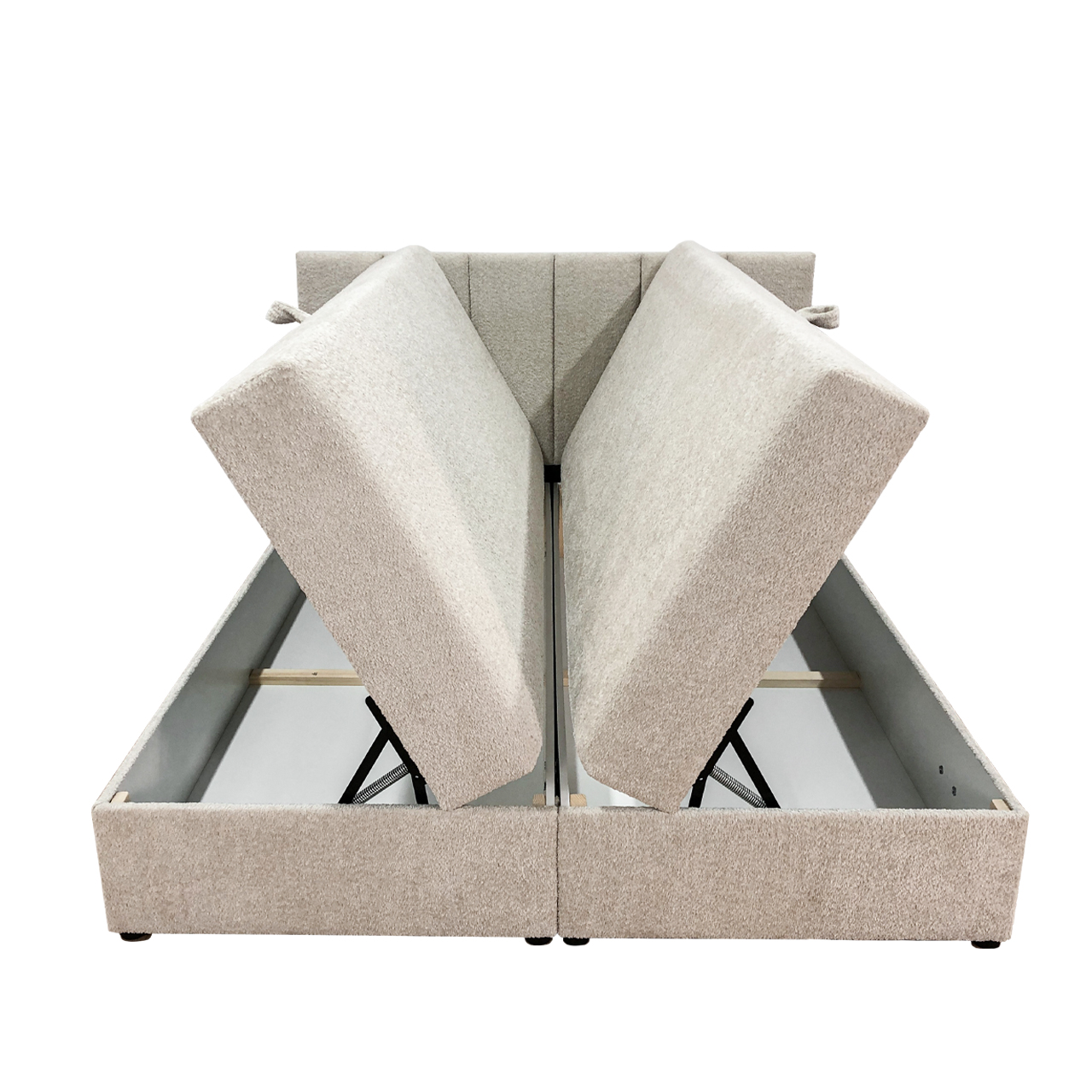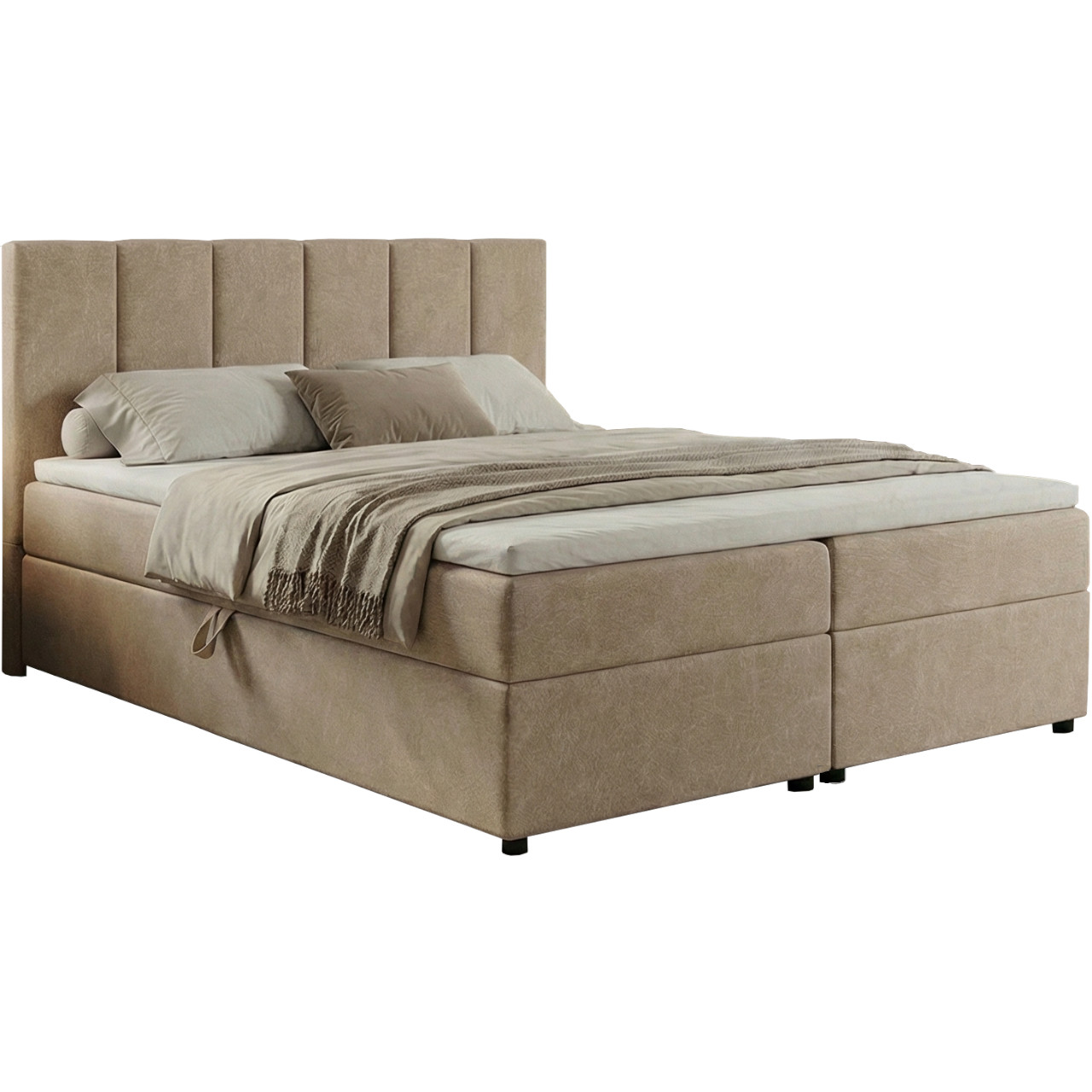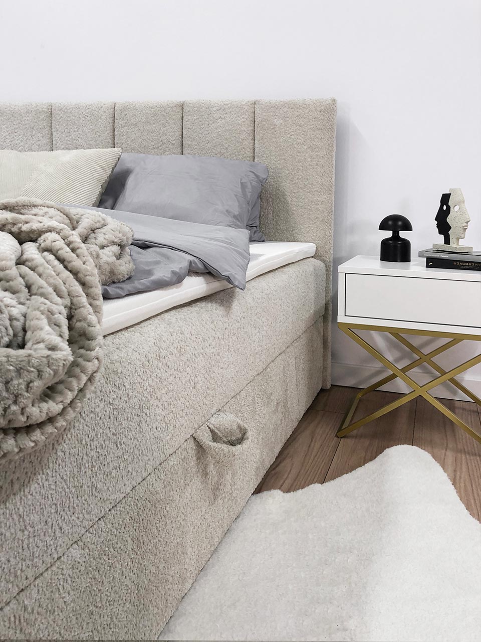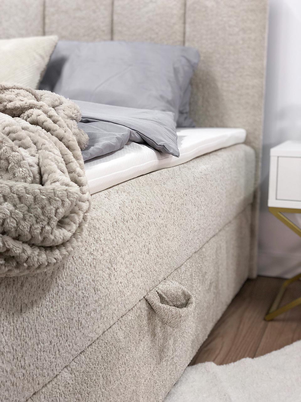 Model wyposażony jest w dwa pojemniki na pościel, otwierane niezależnie, co ułatwia przechowywanie i codzienne użytkowanie. Wysoki zagłówek z pionowymi panelami pełni funkcję dekoracyjną oraz praktyczną, zapewniając wygodne oparcie podczas odpoczynku.