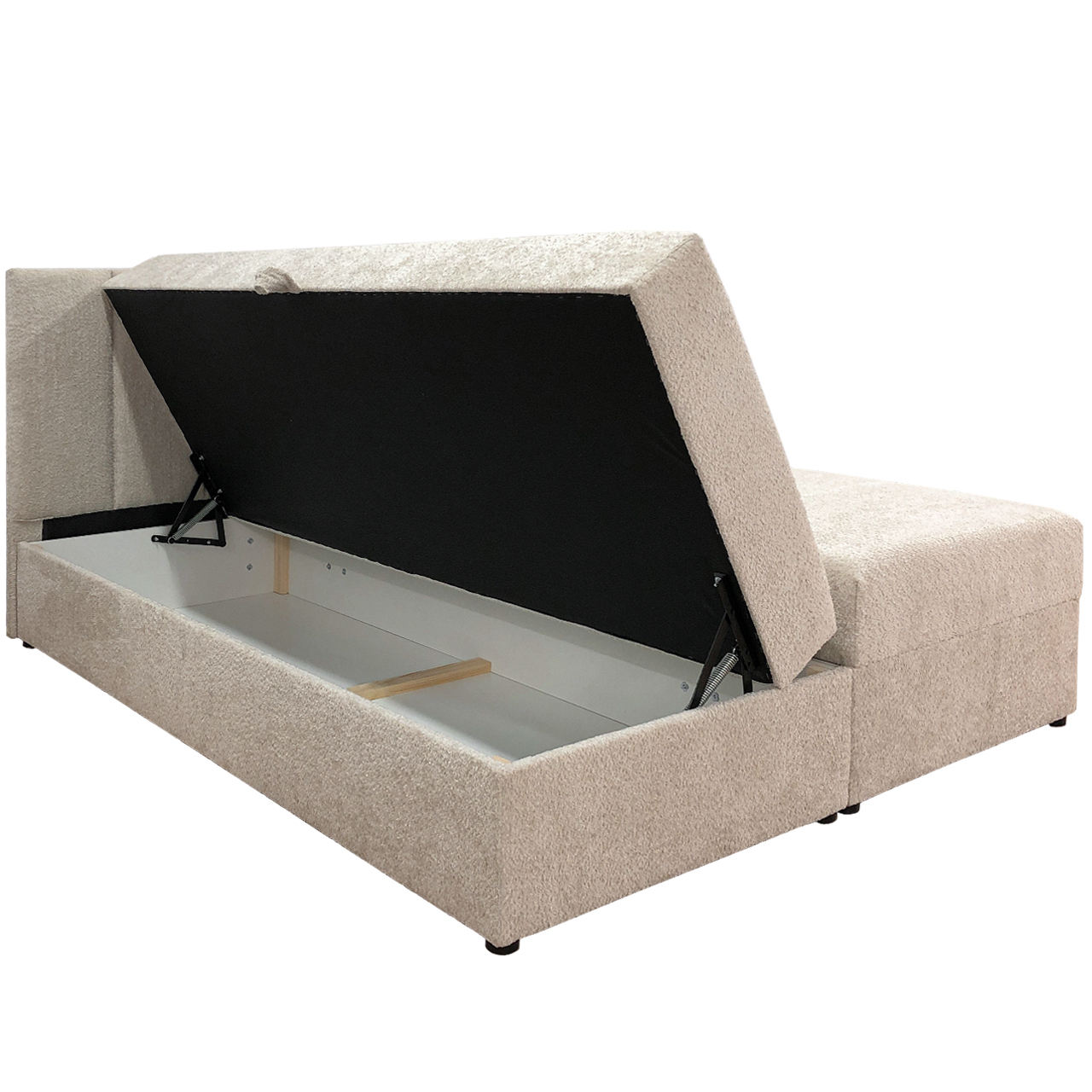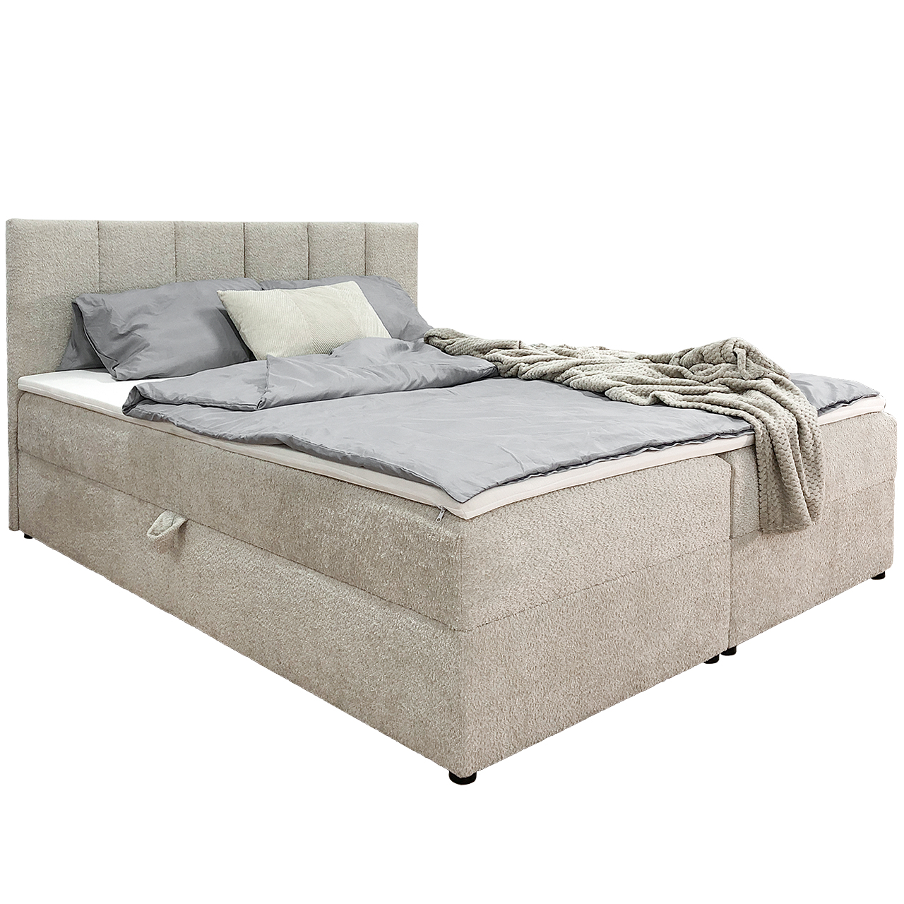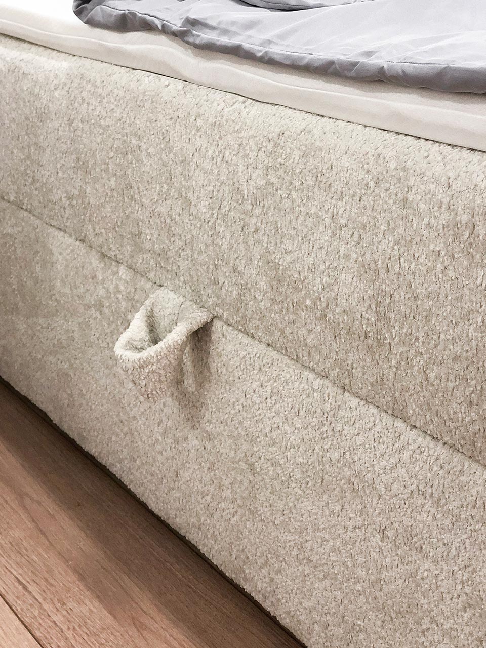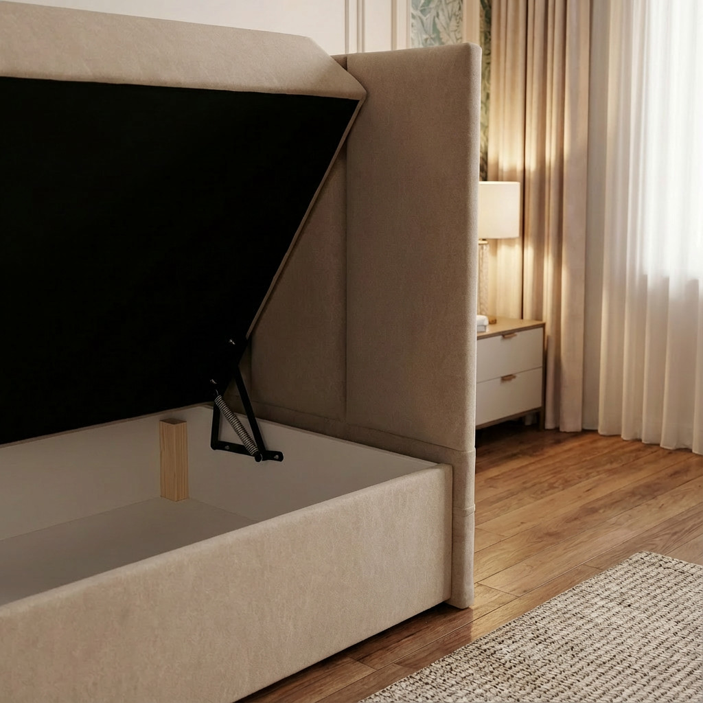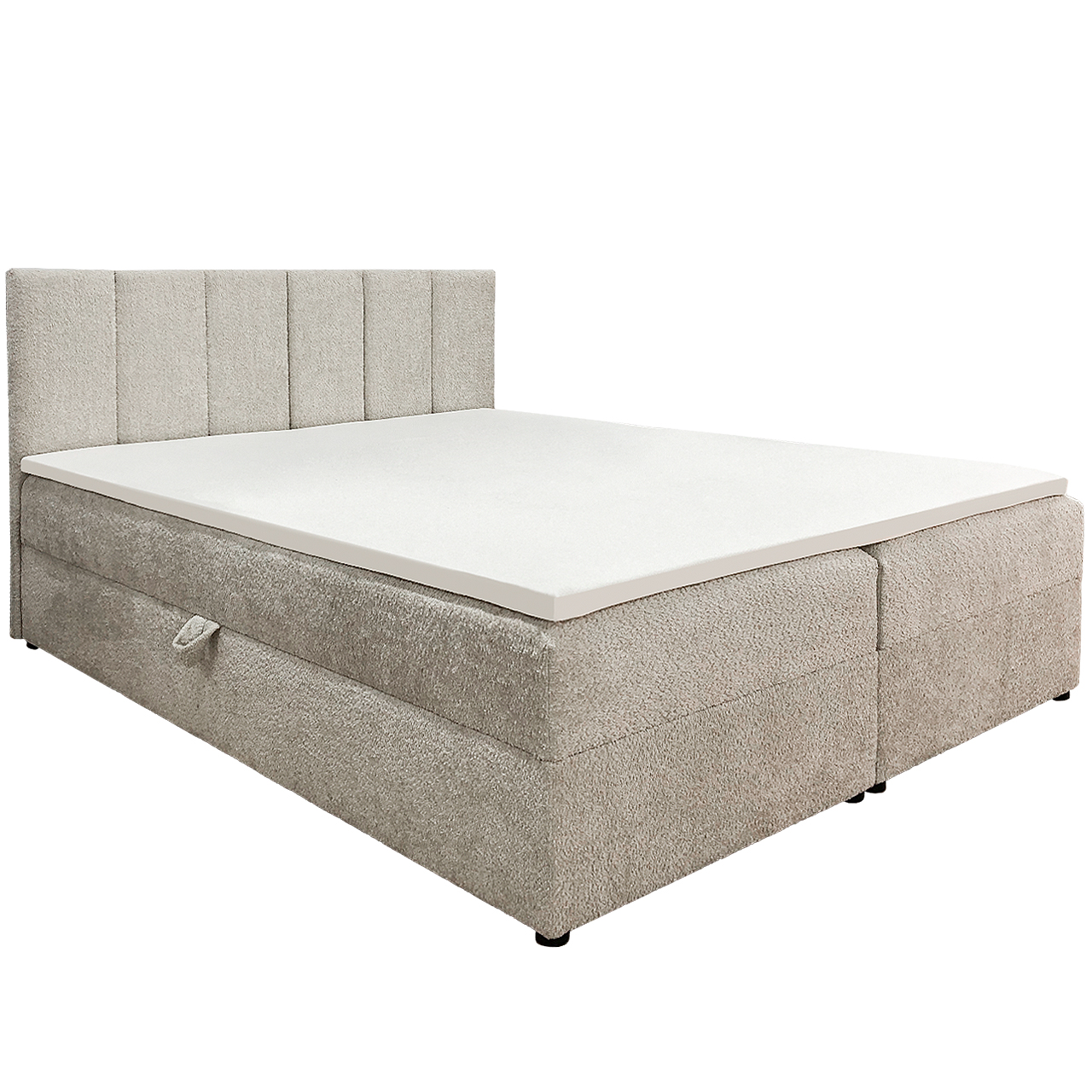 Model wyposażony jest w dwa pojemniki na pościel, otwierane niezależnie, co ułatwia przechowywanie i codzienne użytkowanie. Wysoki zagłówek z pionowymi panelami pełni funkcję dekoracyjną oraz praktyczną, zapewniając wygodne oparcie podczas odpoczynku.