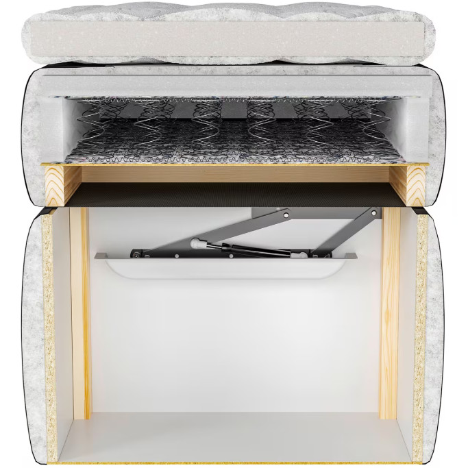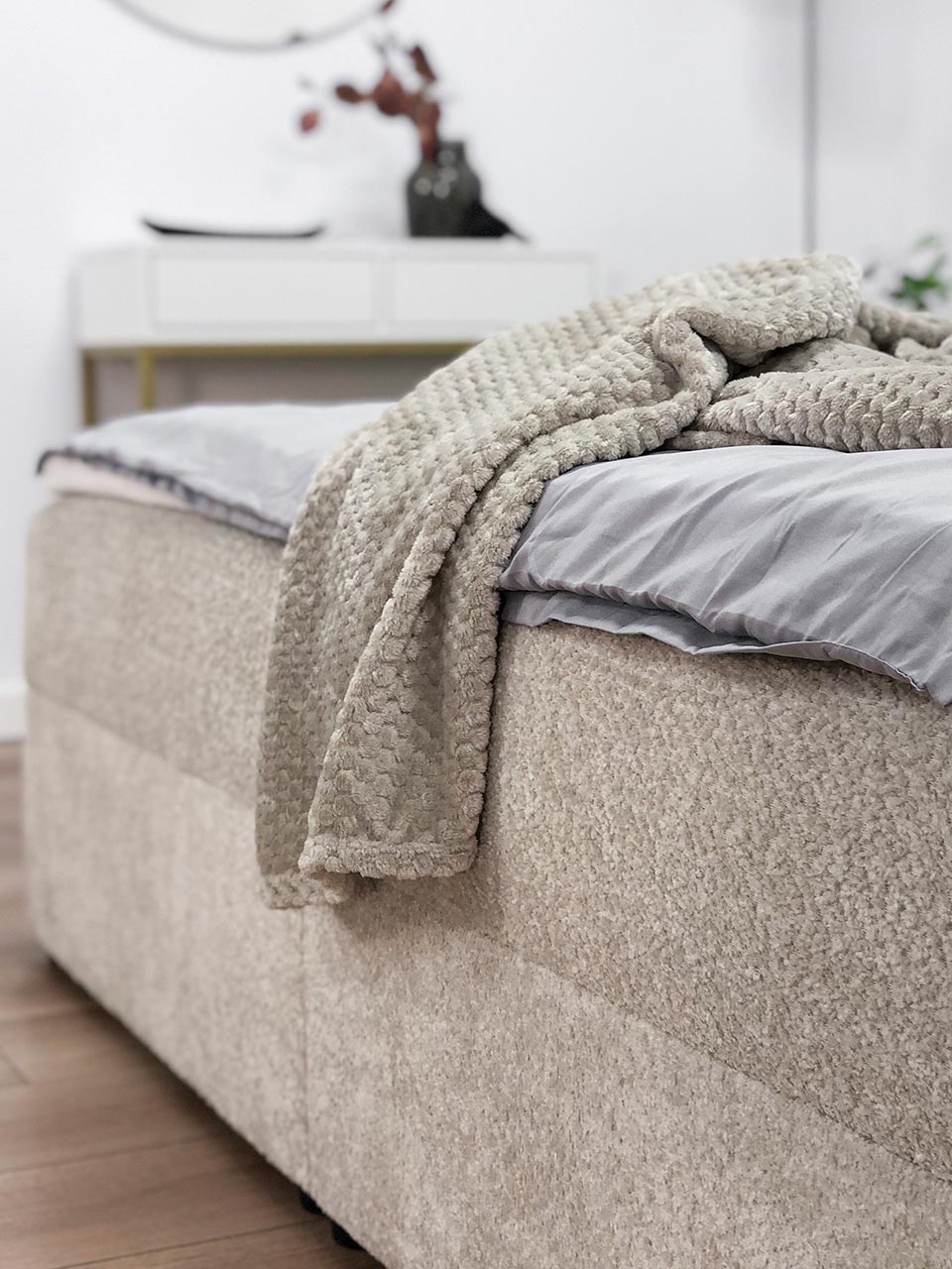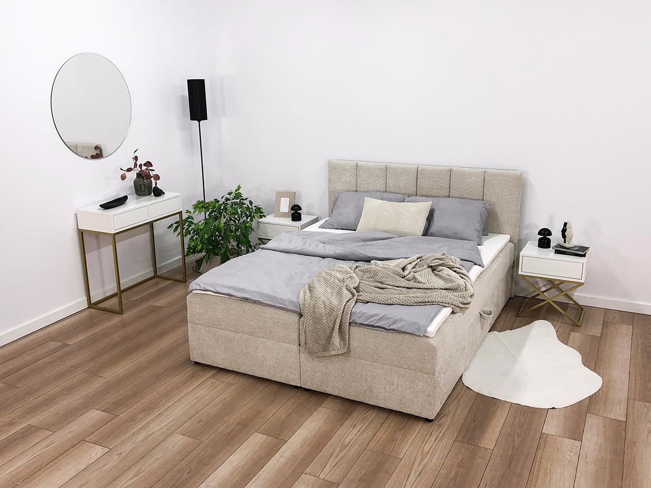 Konstrukcja łóżka oparta jest na drewnie oraz płycie meblowej, co zapewnia stabilność i trwałość użytkowania. Komfort snu gwarantuje system kontynentalny oparty na materacach bonellowych oraz piance poliuretanowej, oferujących sprężystość i odpowiednie podparcie ciała.