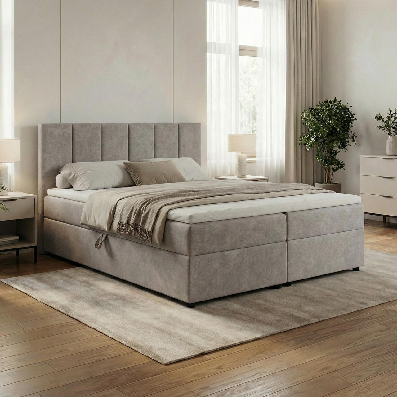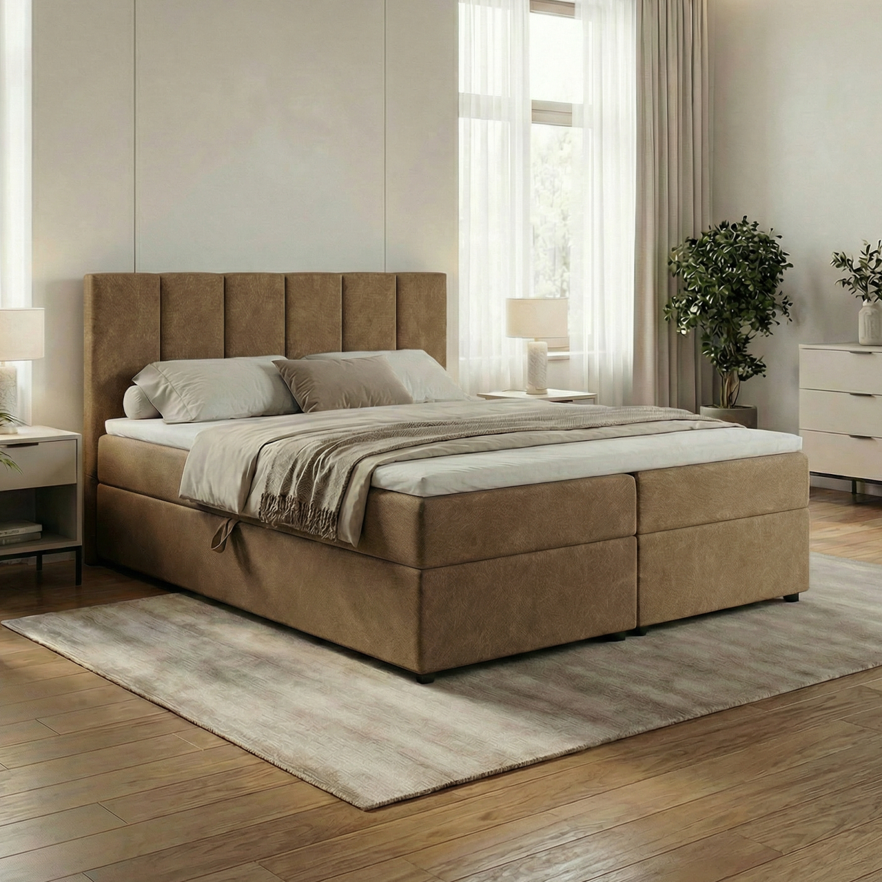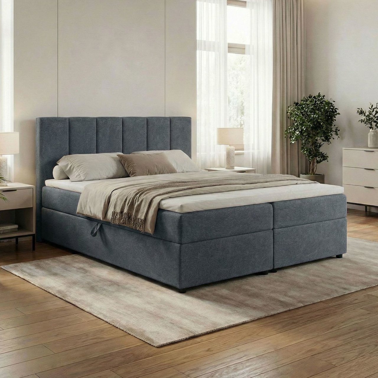 Model wyposażony jest w dwa pojemniki na pościel, otwierane niezależnie, co ułatwia przechowywanie i codzienne użytkowanie. Wysoki zagłówek z pionowymi panelami pełni funkcję dekoracyjną oraz praktyczną, zapewniając wygodne oparcie podczas odpoczynku.