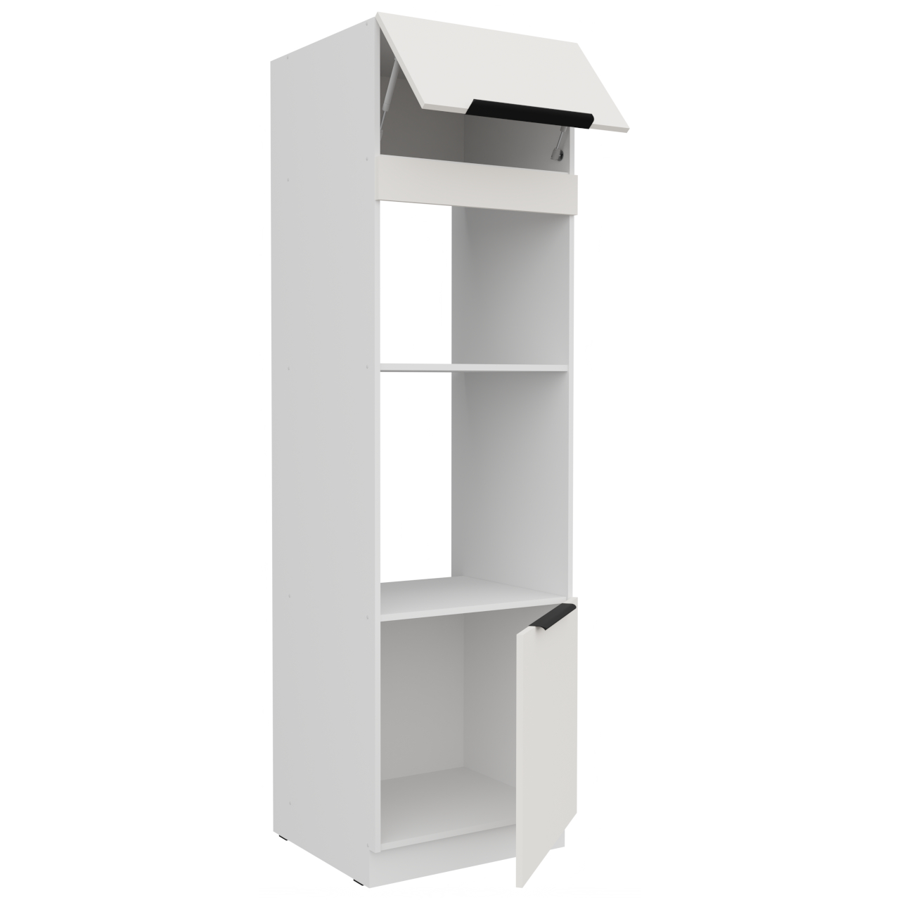 Wnętrze szafki w kolorze białym. Szafka ma jedną półkę. Otwory na uchwyt wiercone nieprzelotowo. Szafka zabudowa piekarnika i mikrofalówki. |