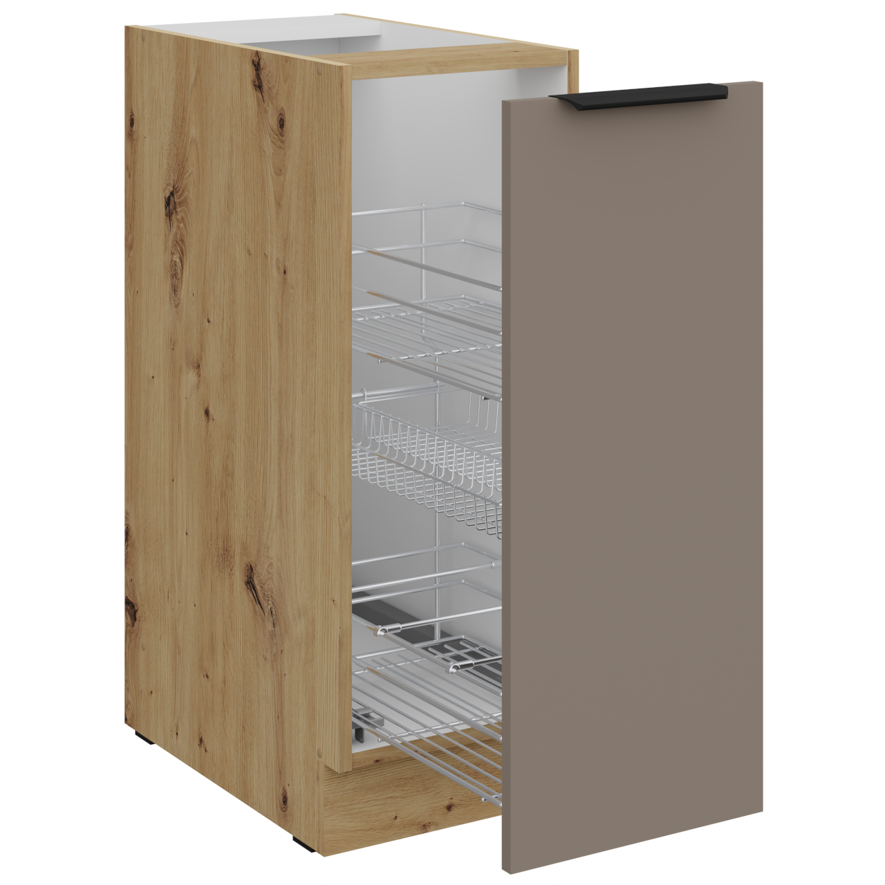 Wnętrze szafki w kolorze białym. Otwory na uchwyt wiercone nieprzelotowo. Kosz CARGO chromowany. Kosz CARGO montaż dolny. |