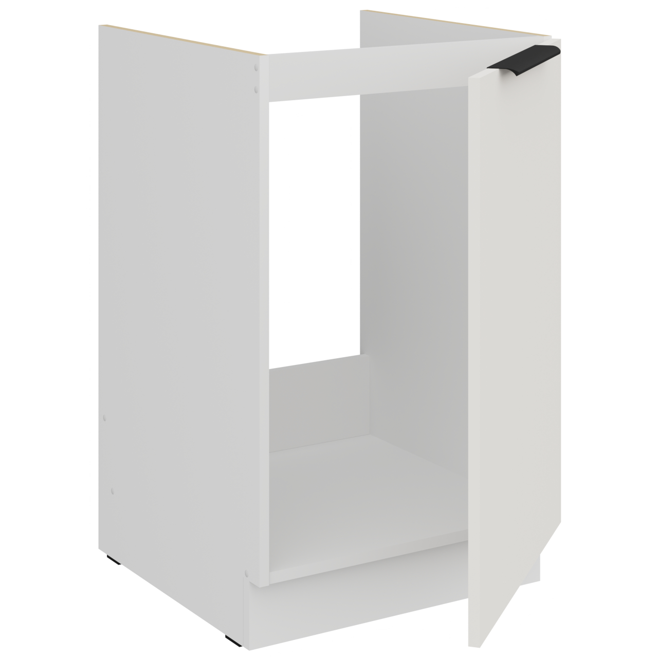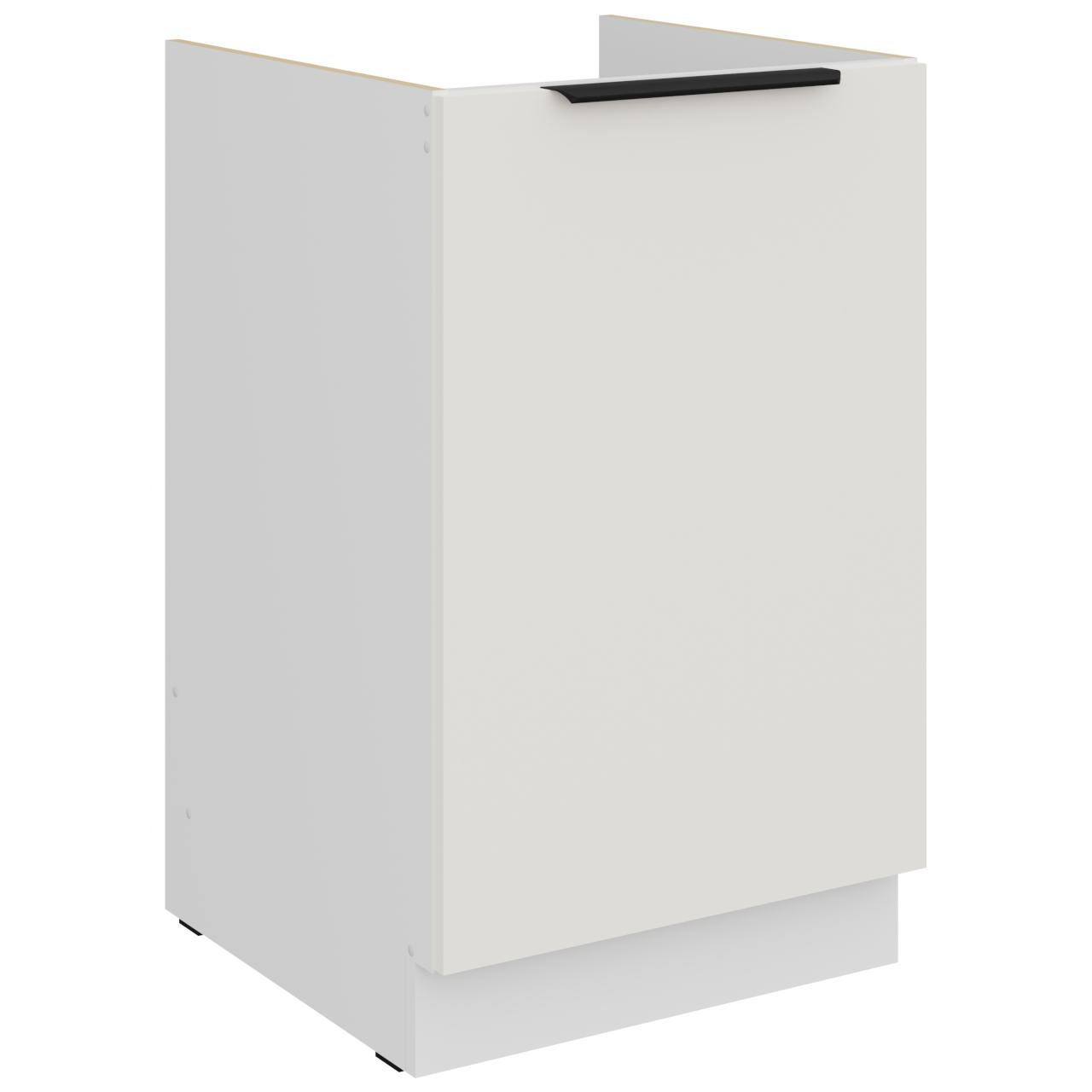 Szafka dolna pod zlew. Szafka posiada jeden front. Wnętrze szafki w kolorze białym. Otwory na uchwyt wiercone nieprzelotowo. |