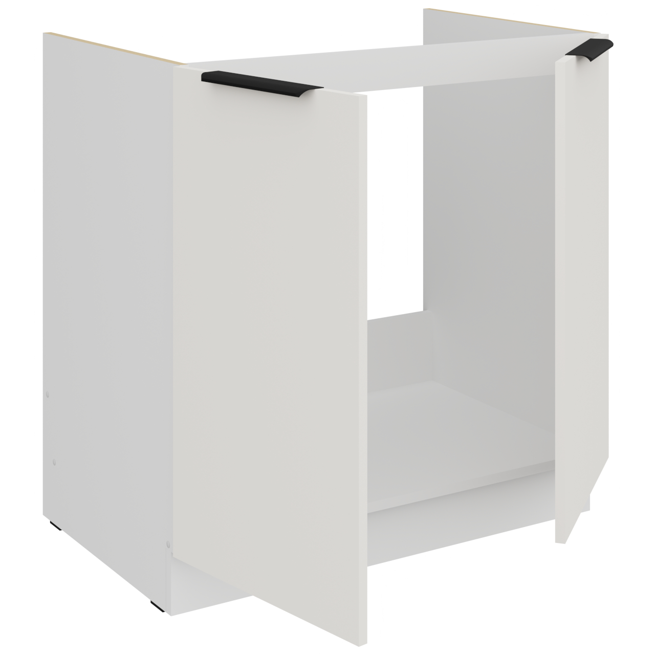Wnętrze szafki w kolorze białym. Szafka posiada dwoje drzwi. Otwory na uchwyt wiercone nieprzelotowo. Szafka dolna pod zlew. |