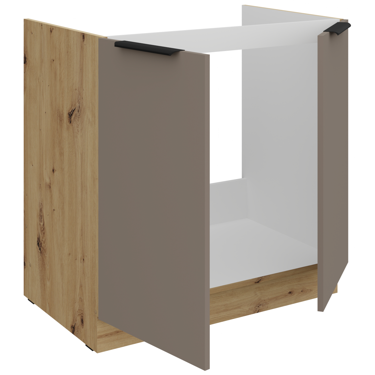 Wnętrze szafki w kolorze białym. Szafka posiada dwoje drzwi. Otwory na uchwyt wiercone nieprzelotowo. Szafka dolna pod zlew. |