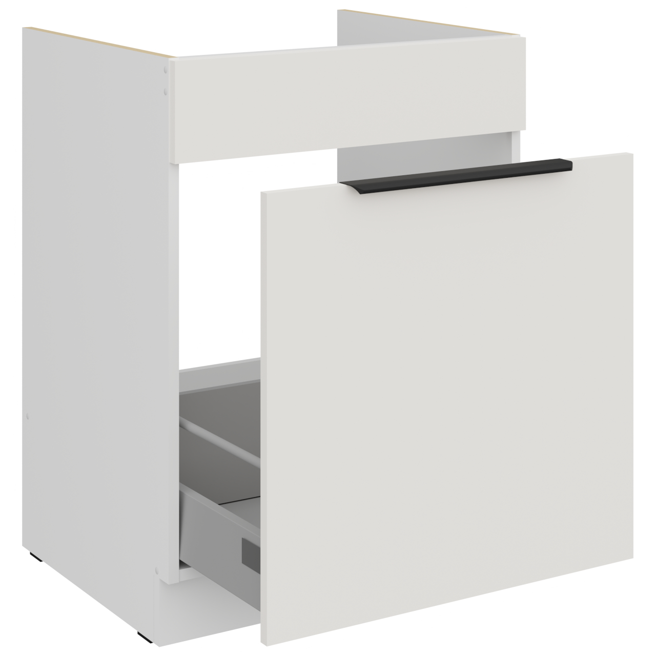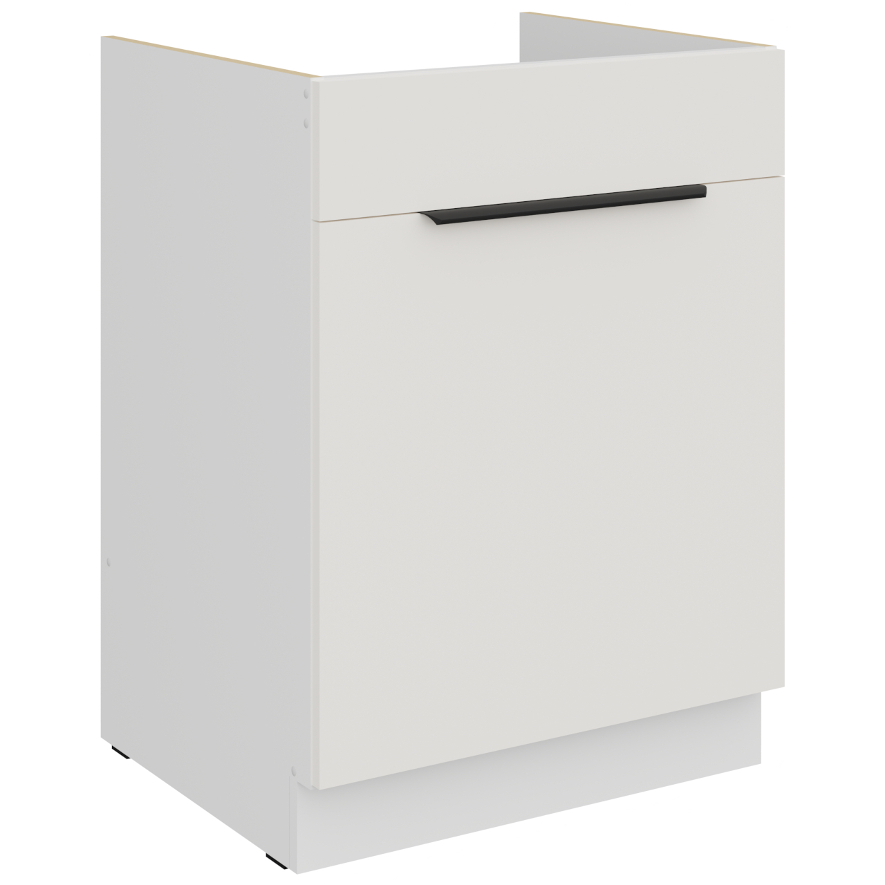 Szafka dolna pod zlew. Wnętrze szafki w kolorze białym. Otwory na uchwyt wiercone nieprzelotowo. |