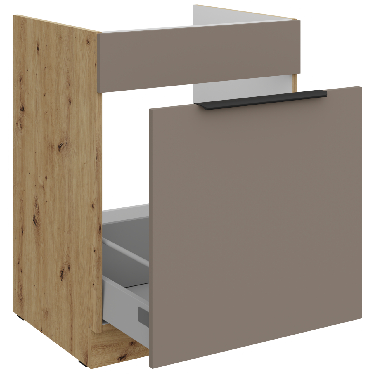 Szafka dolna pod zlew. Wnętrze szafki w kolorze białym. Otwory na uchwyt wiercone nieprzelotowo. |
