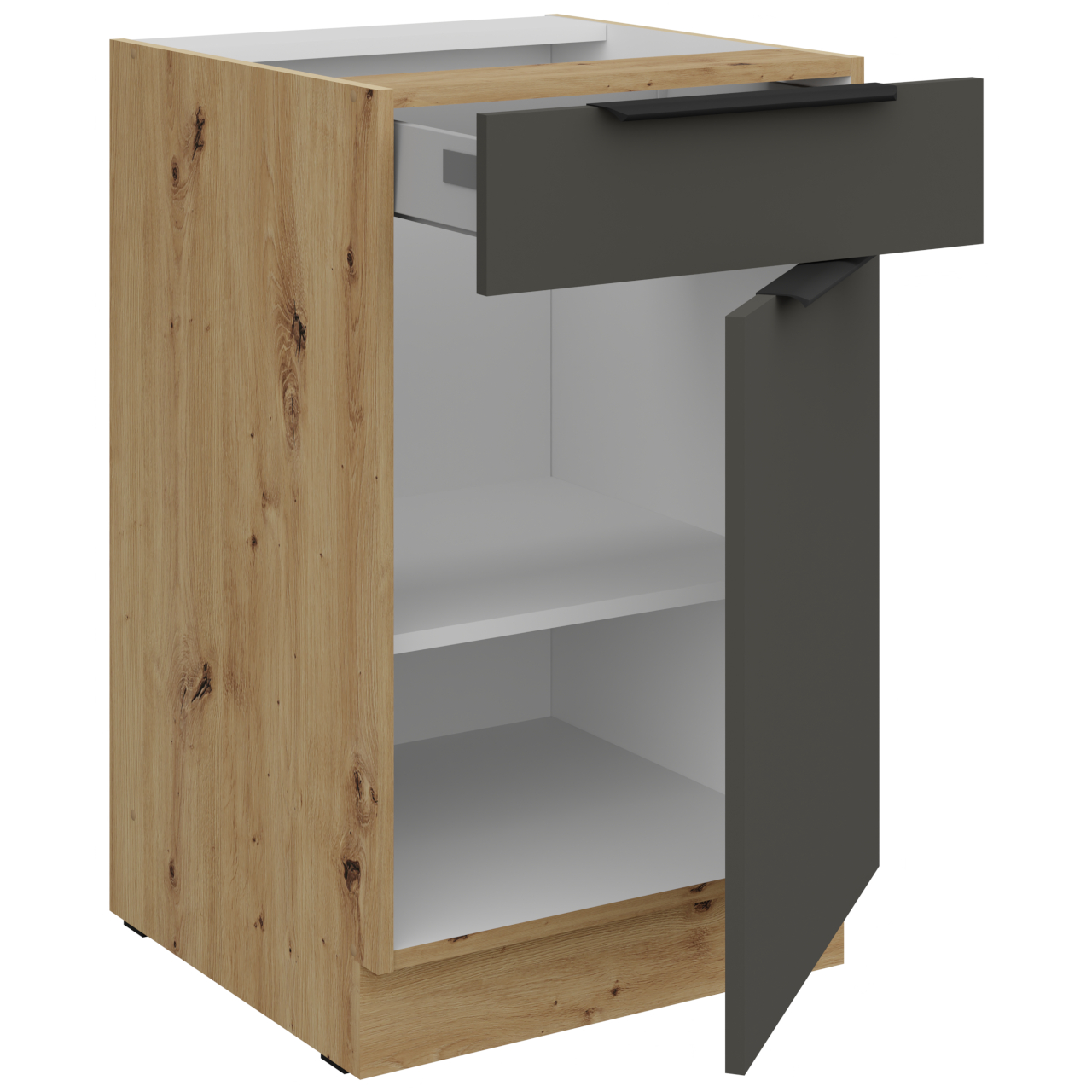 Szafka posiada jeden front. Szafka ma jedną półkę. Wnętrze szafki w kolorze białym. Otwory na uchwyt wiercone nieprzelotowo. Dno szuflady o grubości 16 mm w kolorze szarym. |