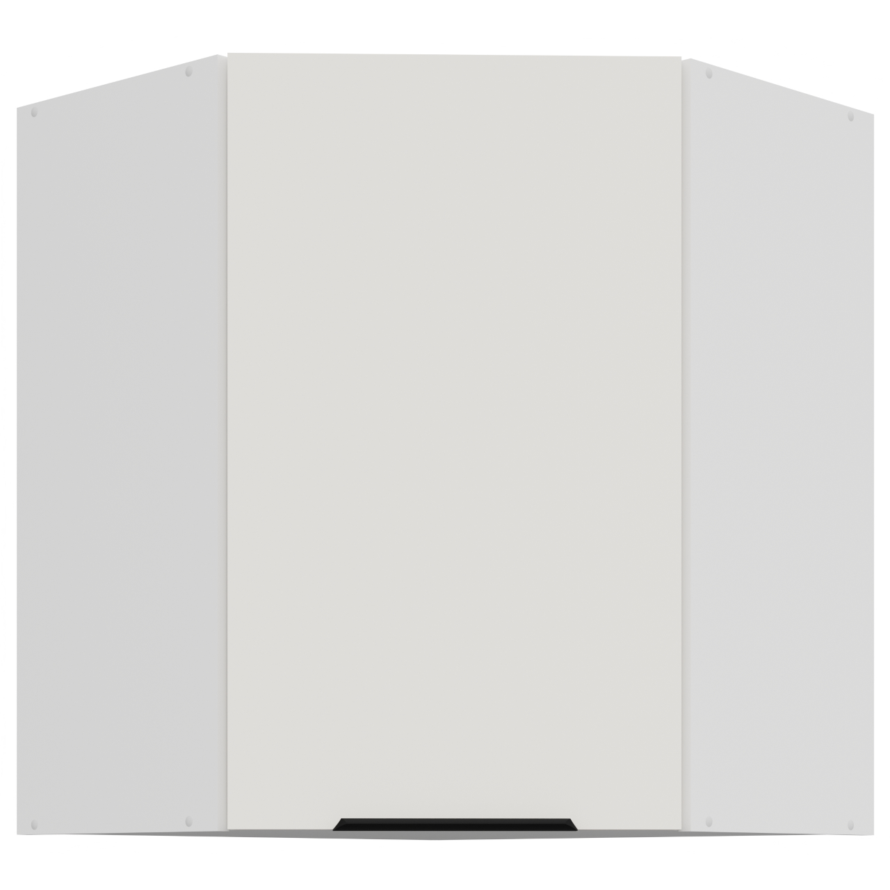 Wnętrze szafki w kolorze białym. Szafka ma dwie półki. Otwory na uchwyt wiercone nieprzelotowo. Drzwi montowane pod kątem 45°. |