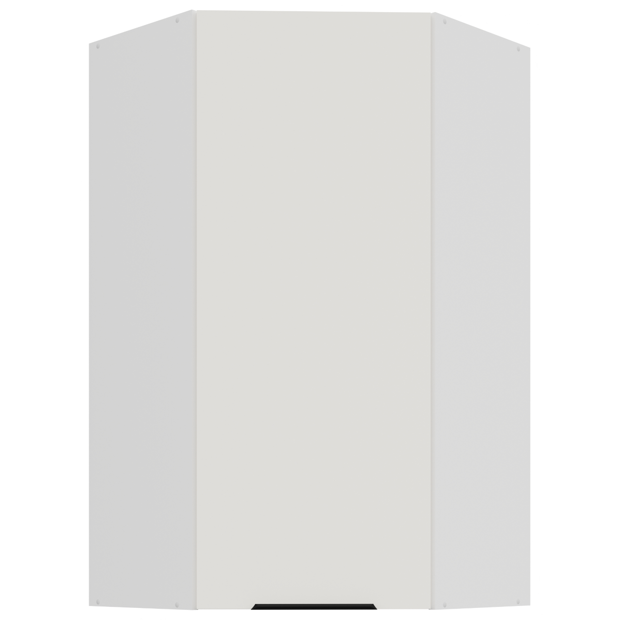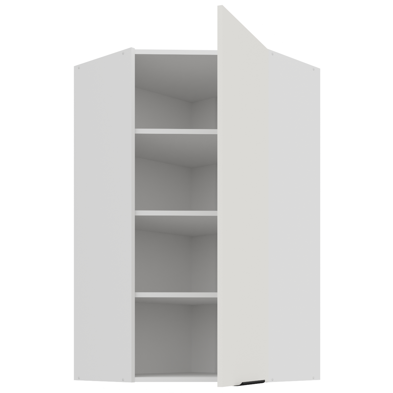 Wnętrze szafki w kolorze białym. Szafka ma trzy półki. Otwory na uchwyt wiercone nieprzelotowo. Drzwi montowane pod kątem 45°. |