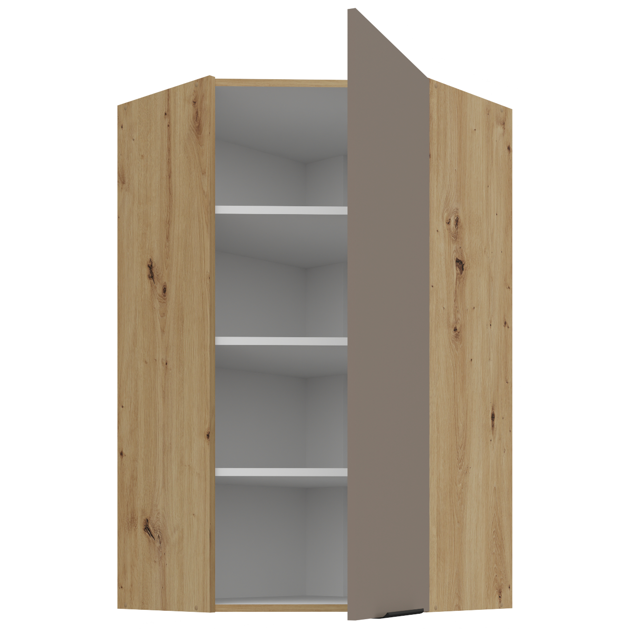 Wnętrze szafki w kolorze białym. Szafka ma trzy półki. Otwory na uchwyt wiercone nieprzelotowo. Drzwi montowane pod kątem 45°. |