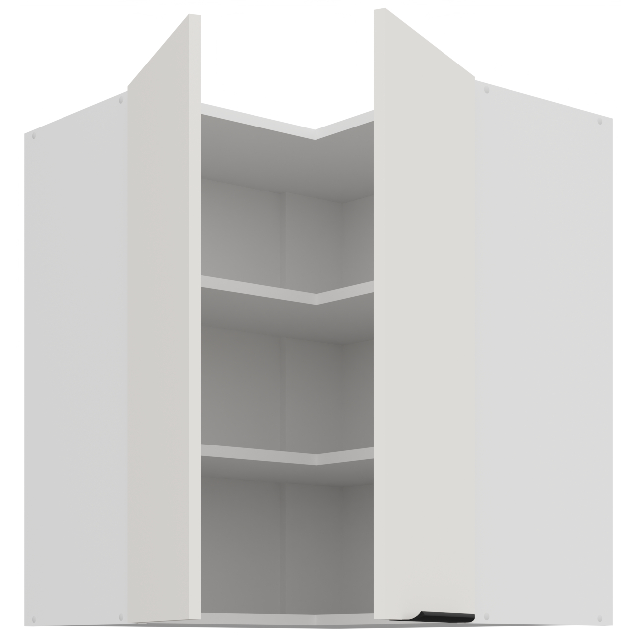 Wnętrze szafki w kolorze białym. Otwory na uchwyt wiercone nieprzelotowo. Szafka ma trzy półki. |