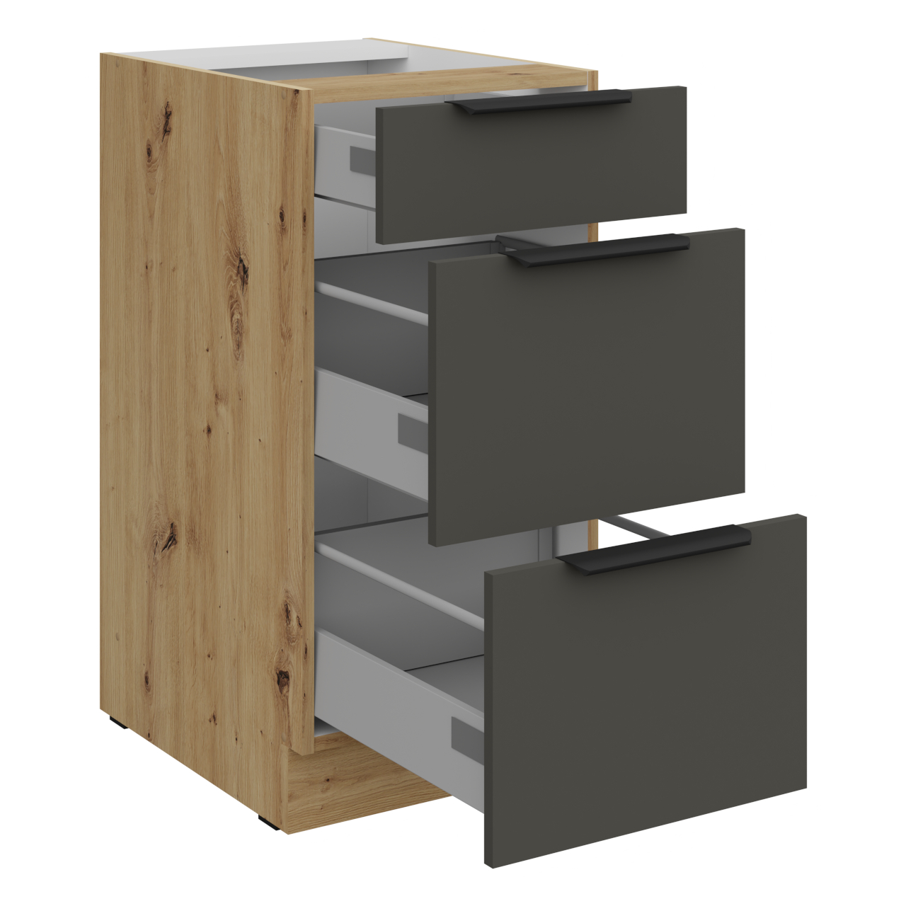 Wnętrze szafki w kolorze białym. Dno szuflady o grubości 16mm w kolorze szarym. Boki szuflady metalowe. Otwory na uchwyt wiercone nieprzelotowo. |