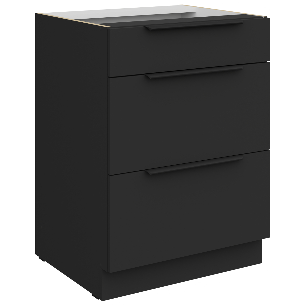 Wnętrze szafki w kolorze białym. Otwory na uchwyt wiercone nieprzelotowo. Dno szuflady o grubości 16mm w kolorze szarym. Boki szuflady metalowe. |