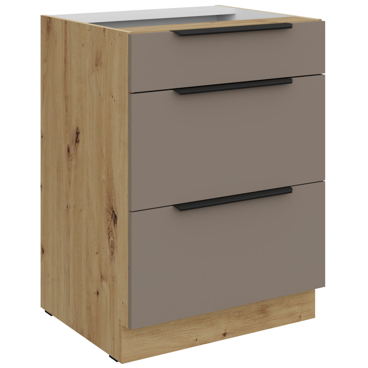 Wnętrze szafki w kolorze białym. Otwory na uchwyt wiercone nieprzelotowo. Dno szuflady o grubości 16mm w kolorze szarym. Boki szuflady metalowe. |