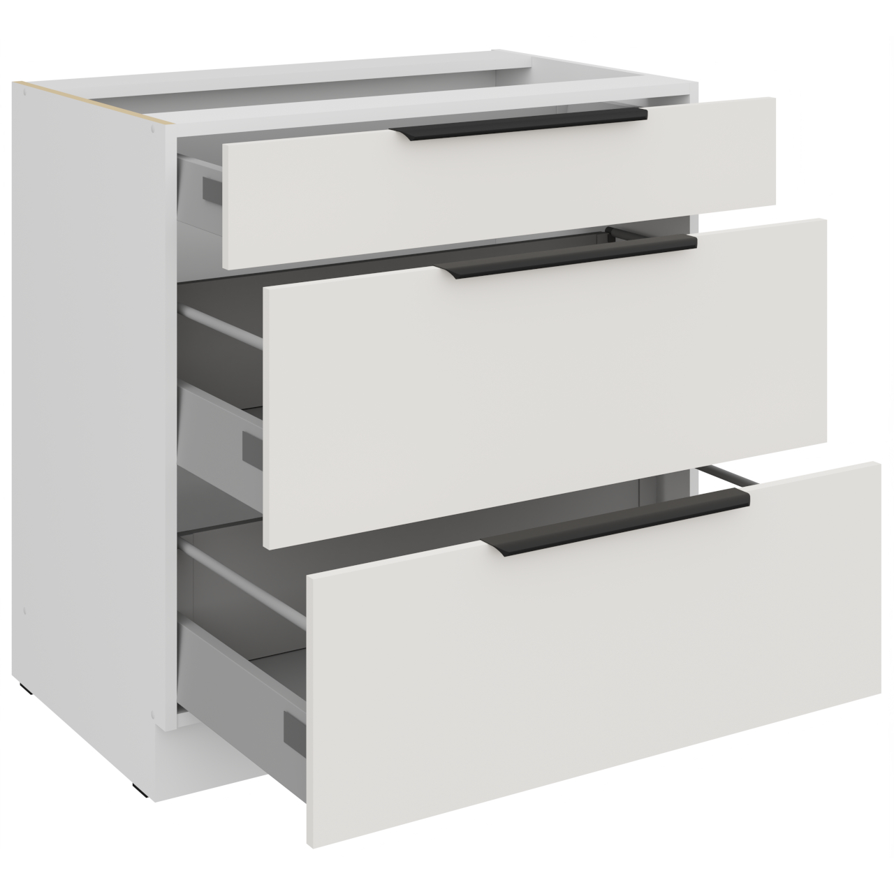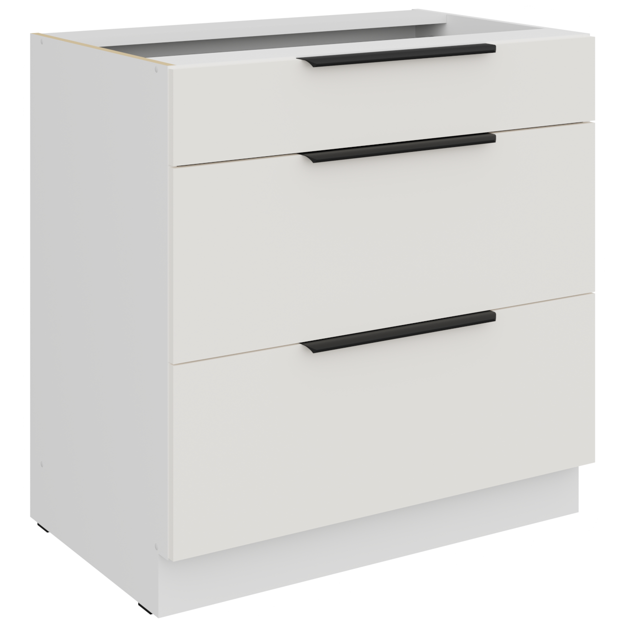 Wnętrze szafki w kolorze białym. Otwory na uchwyt wiercone nieprzelotowo. Dno szuflady o grubości 16mm w kolorze szarym. Boki szuflady metalowe. |